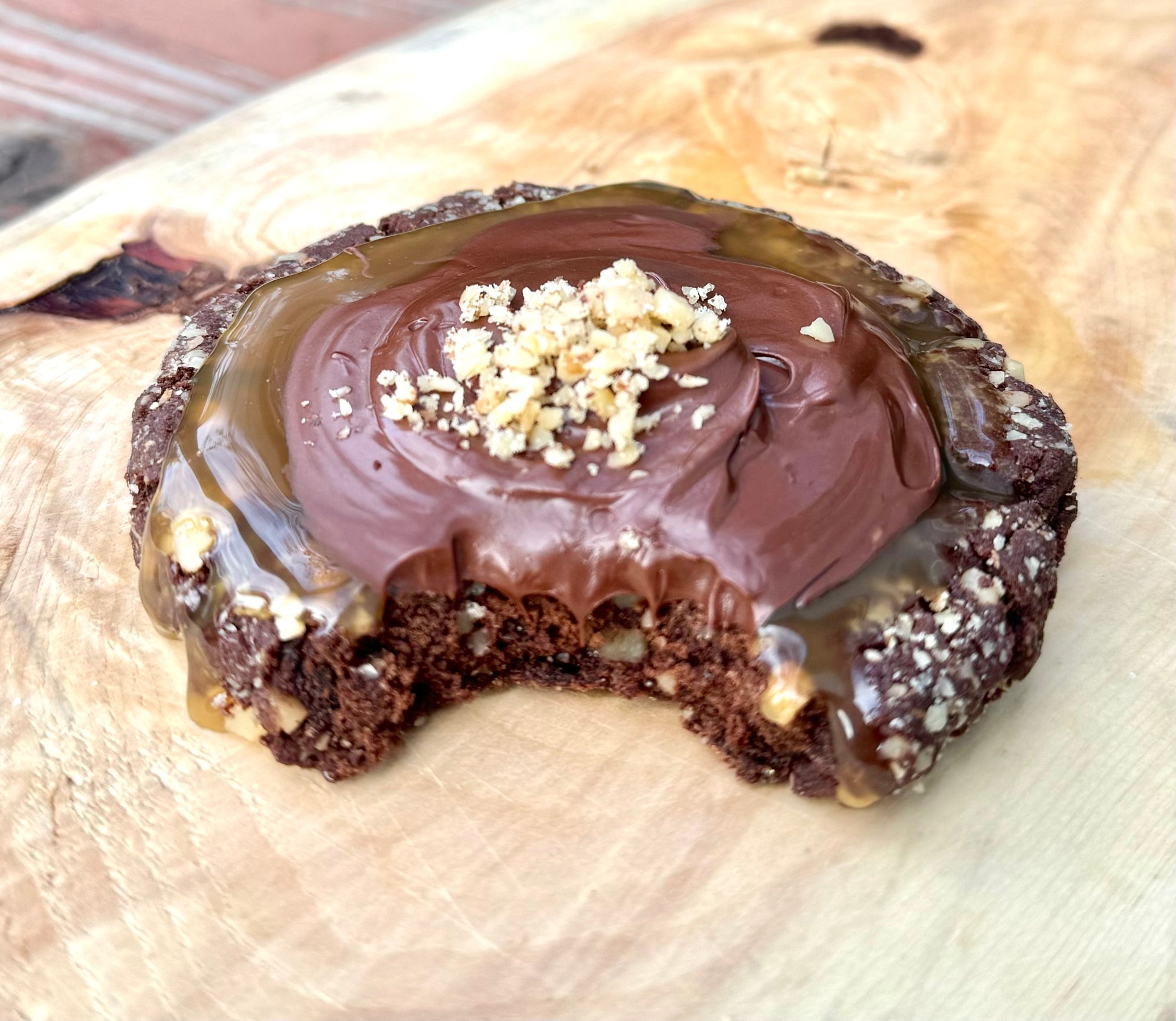 • This recipe is for a rich chocolatey cookie base with chopped pecans, topped with buttery caramel and smooth, silky chocolate. Garnished with pecans
