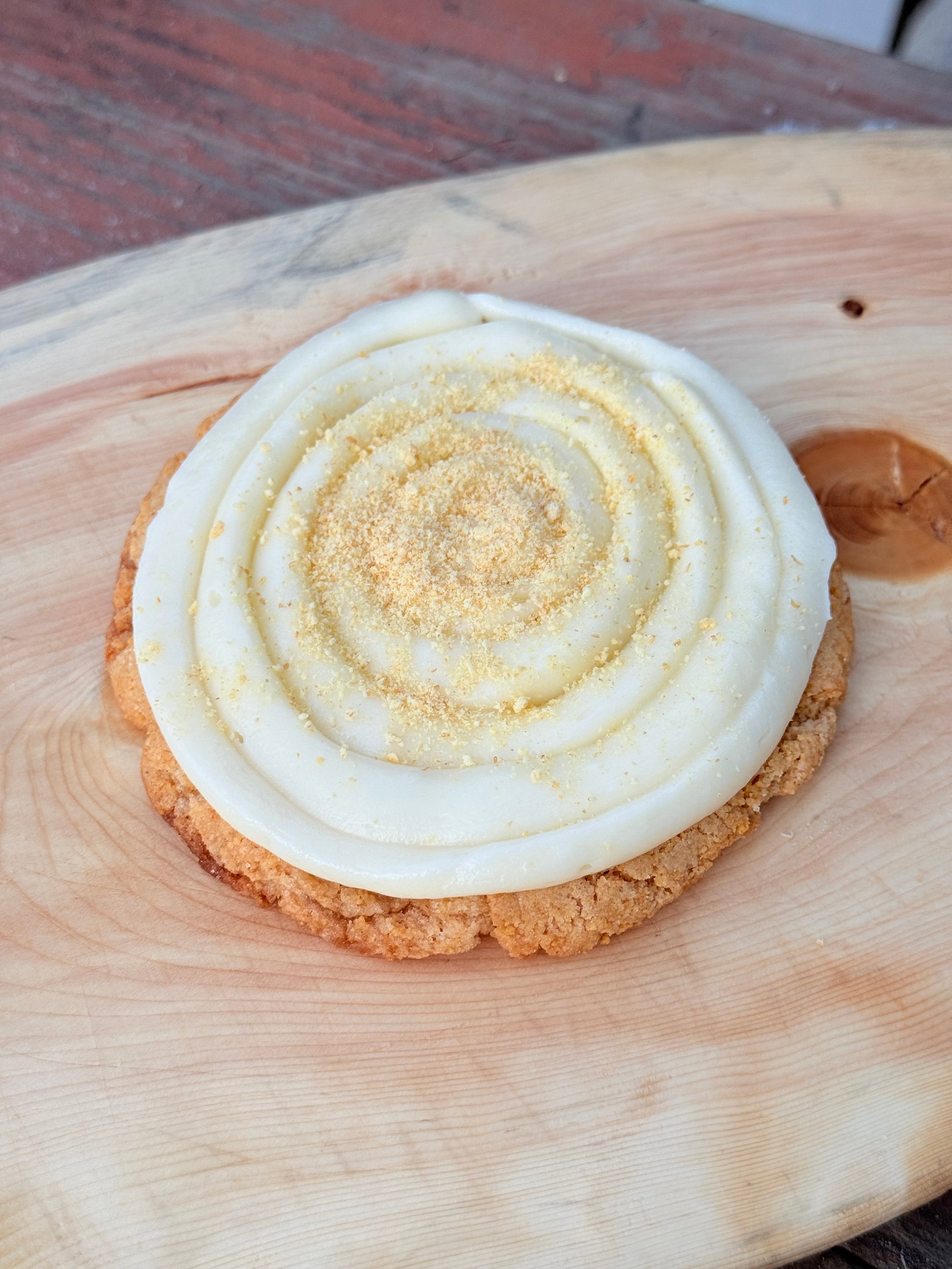 • This recipe is for a buttery graham cracker cookie base topped with a creamy, rich cheesecake frosting, garnished with graham cracker crumbs