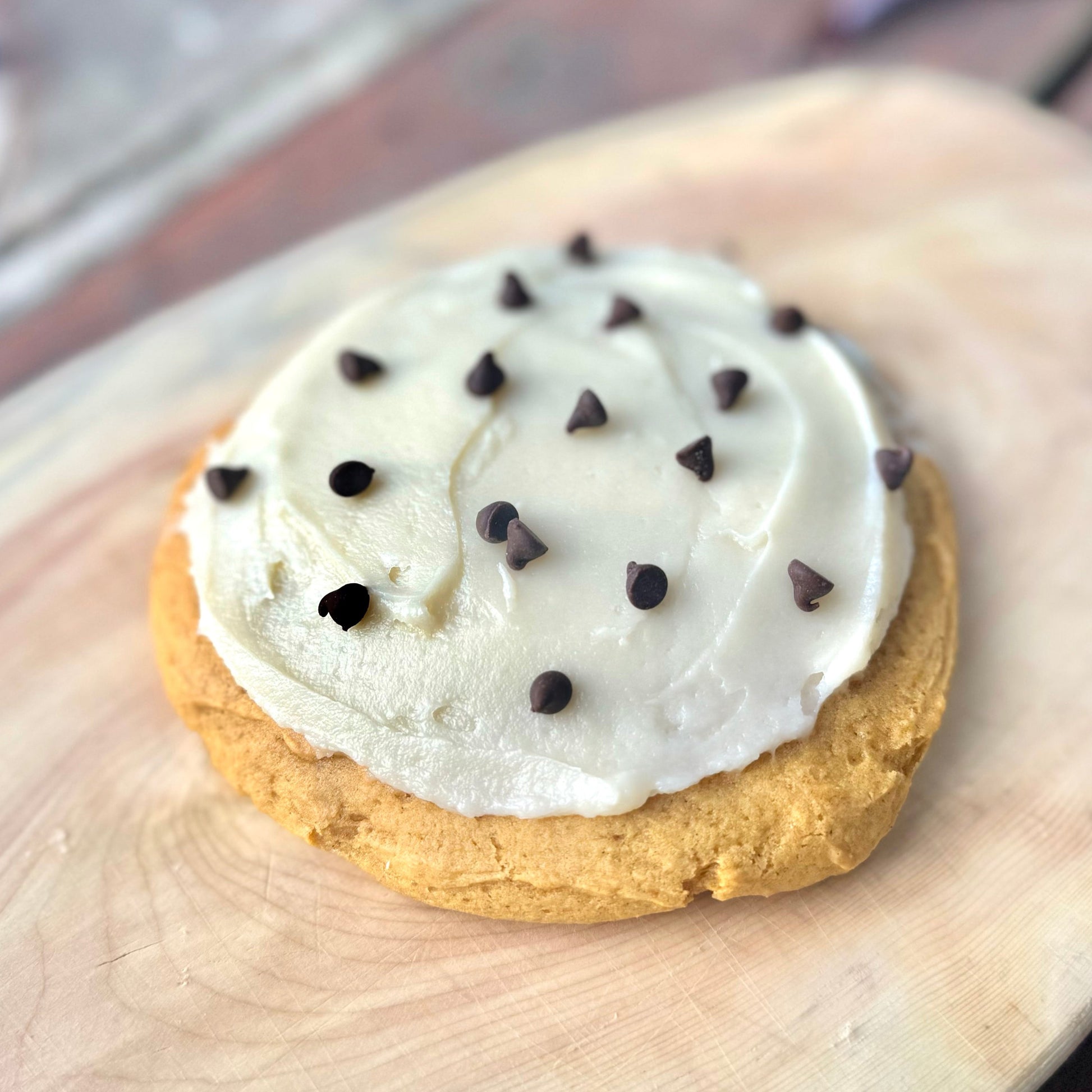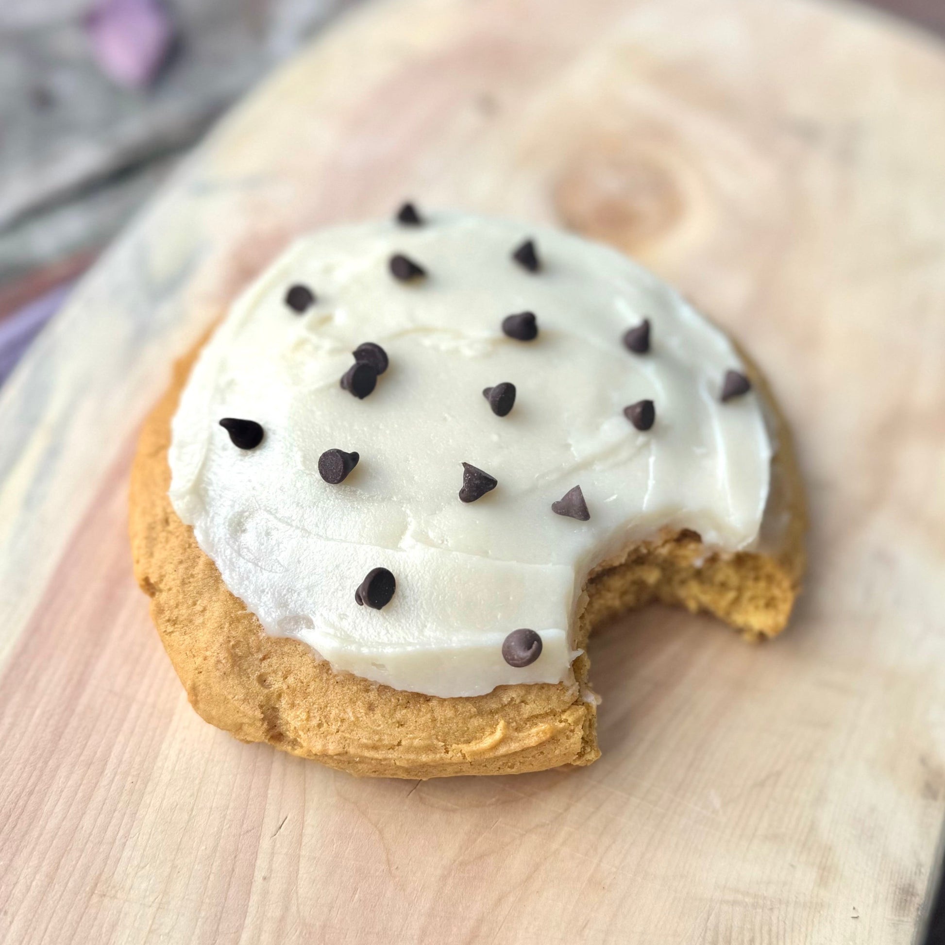 • This recipe is for a sweet, fluffy pumpkin cake-like cookie base with a velvety cream cheese frosting, garnished with miniature chocolate chips